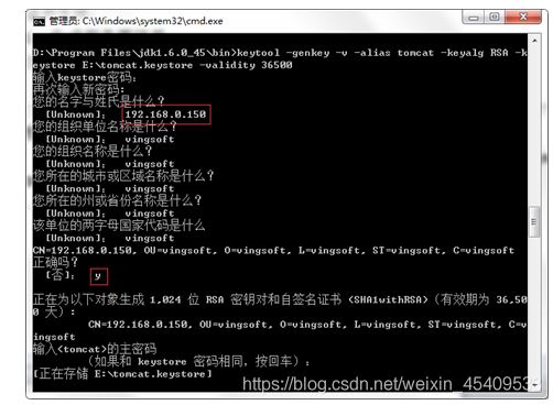 (2)keytool為Tomcat生成證書(“-validity 36500”證書有效期,36500表示100年,默認值是90天)