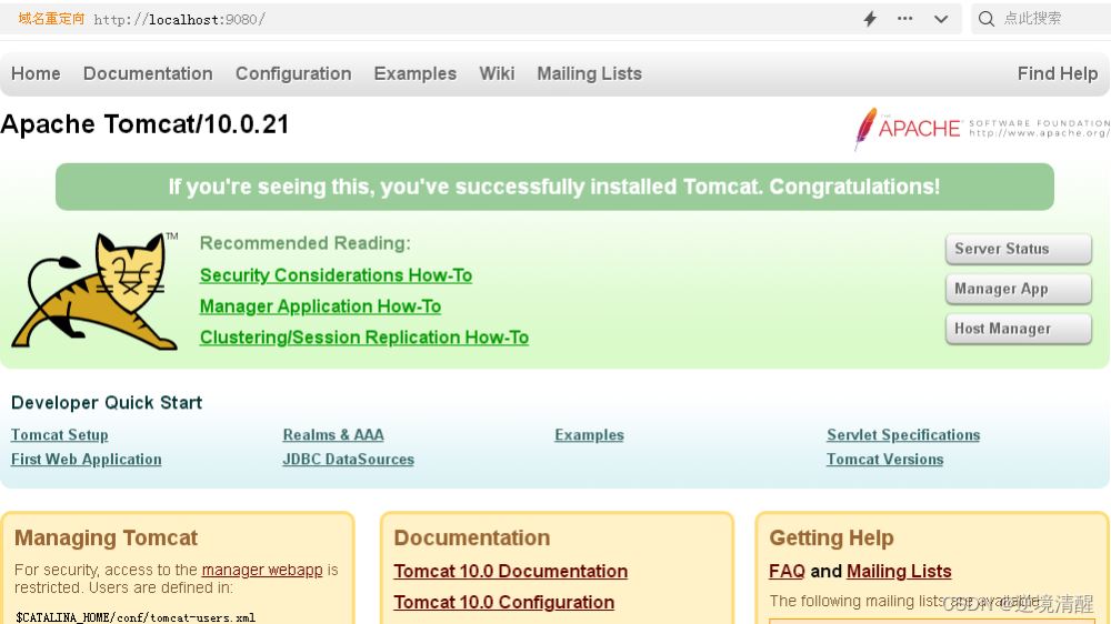 5、然后打開瀏覽器,輸入:http://localhost:9080,就可以發(fā)現(xiàn)Tomcat正常啟動了。