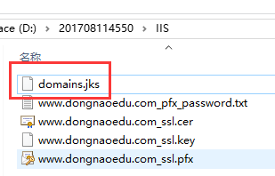 這里要輸入密碼,就是上面www.dongnaoedu.com_pfx_password.txt文本文件中的密碼,3個(gè)口令最好都輸入這個(gè)密碼。可以看到文件夾中生成了domains.jks證書(shū)