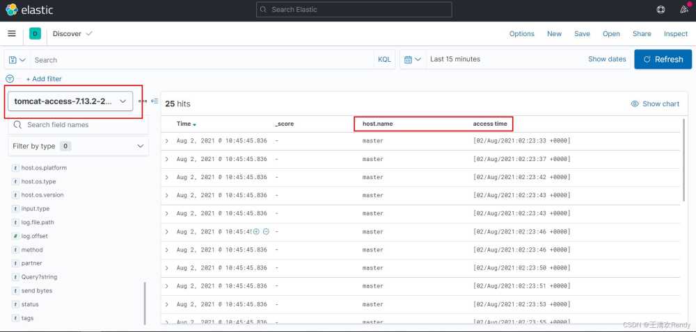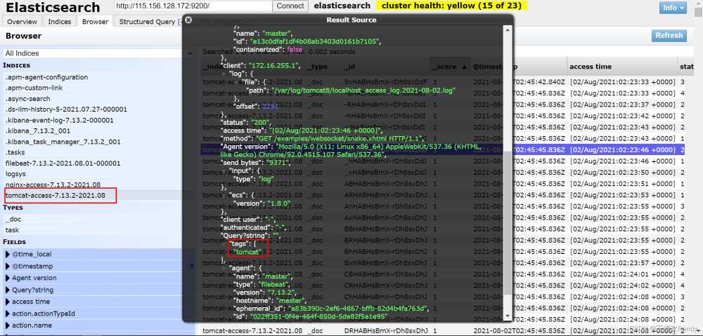 # ================== Filebeat inputs ===============# ------------------------------Tomcat----------------------------------- type: log enabled: true paths: # - /var/log/tomcat8/localhost_access_log.2021-08-02.log # 為了能夠采集所有日期的日志,將文件名中的指定日期改成通配符`*` - /var/log/tomcat8/localhost_access_log.*.log json.keys_under_root: true json.overwrite_keys: true tags: ["tomcat"]# ================================== Outputs ===================================# ---------------------------- Elasticsearch Output ----------------------------output.elasticsearch: hosts: ["172.16.255.131:9200"] indices: - index: "nginx-access-%{[agent.version]}-%{+yyyy.MM}"when.contains: tags: "access" - index: "nginx-error-%{[agent.version]}-%{+yyyy.MM}"when.contains: tags: "error"# 在輸出配置中添加如下索引設置識別tomcat日志,值得注意的時這里不需要再重新編輯template設置,應該pattern配置只在第一次使用時進行匹配識別 - index: "tomcat-access-%{[agent.version]}-%{+yyyy.MM}"when.contains: tags: "tomcat"04 使用Kibana查看Tomcat日志