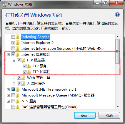 2、一定要將樹形目錄【Internet信息腐乳】展開,然后將【FTP服務】目錄展開(注意的是所有其他配置在這里都要一層層展開才可以勾選住子目錄),勾選中紅色框的部分。