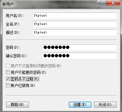 按照上面界面輸入信息,點擊【創建】按鈕,即可以創建了新用戶ftptest?! ?/p>