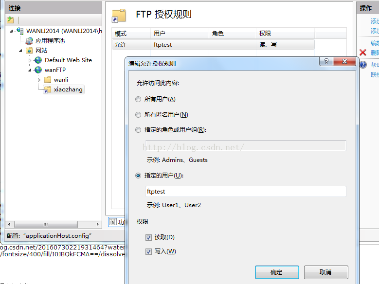 ?、?、授權選擇【所有用戶】,勾選【寫入】即可以上傳文件到FTP服務器站點,勾選【讀取】即可以從FTP服務器站點下載文件。在這里個都勾選即可以上傳下載。