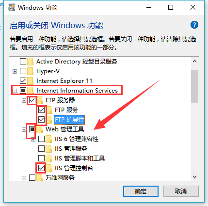 3.在“windows功能”中找到“Internet Information Services”,并選中“FTP服務”、“FTP擴展性”和“IIS管理控制臺”前的復選框,點擊“確定”,如下圖所示: