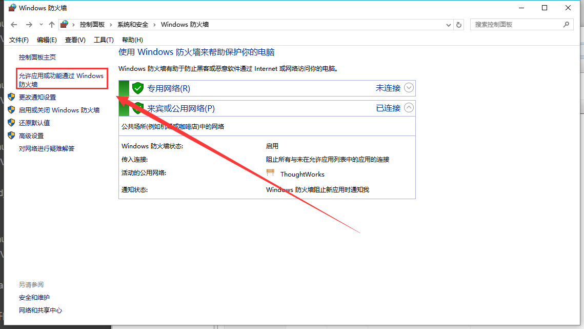 2.點擊允許應用或功能通過Windows訪問防火墻