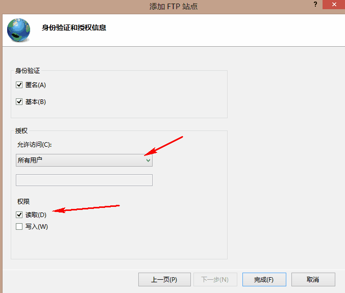 如果只是想設置簡單的FTP,則“身份驗證”和“授權”都勾選“匿名”,并且給匿名設置相應的權限,點擊“完成”,完成FTP站點的設置。其實我也是這么設置的