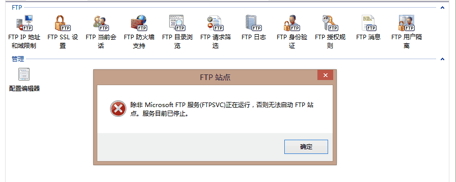 提示:除非 Microsoft FTP 服務(FTPSVC)正在運行,否則無法啟動 FTP 站點。服務目前已停止。