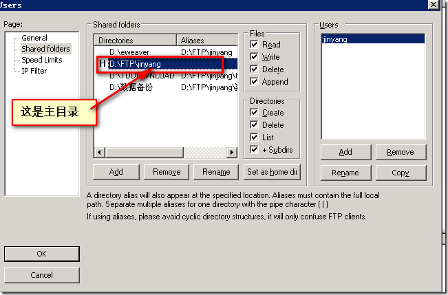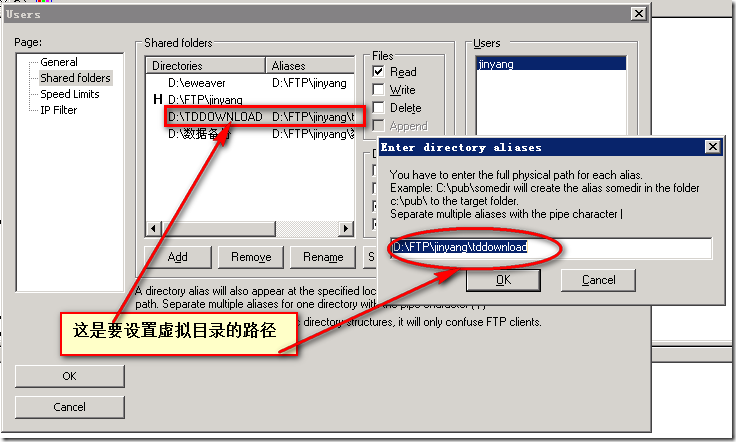 舉例:FileZilla Server的根目錄(即Home目錄)設(shè)為D:\FTP\jinyang\,現(xiàn)在要將D:\TDDOWNLOAD加入虛擬目錄,則第一步添加新目錄D:\TDDOWNLOAD ;第二步在已添加目錄項(xiàng)D:\TDDOWNLOAD單擊右鍵,選擇edit alias(別名),設(shè)置alias為D:\FTP\jinyang\alias-name。其中alias-name為虛擬目錄名,可以與實(shí)際的目錄名(如D:\TDDOWNLOAD)不同。