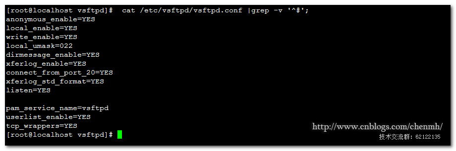 cat /etc/vsftpd/vsftpd.conf |grep -v "^#";