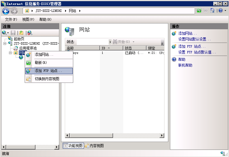 3、在網(wǎng)站右鍵,選擇添加FTP站點,如圖: