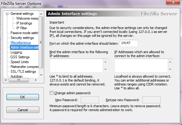 注意:修改端口和密碼非常重要,這是確保Filezilla安全的重點,必須修改端口,必須設(shè)置密碼!密碼建議足夠復(fù)雜!可以在管理界面中進(jìn)行修改