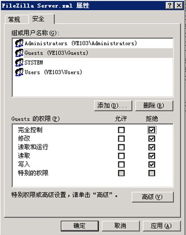 加入Guest組禁止讀寫的權(quán)限,設(shè)置為拒絕。