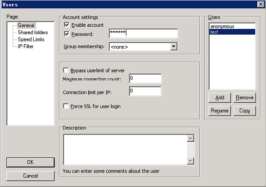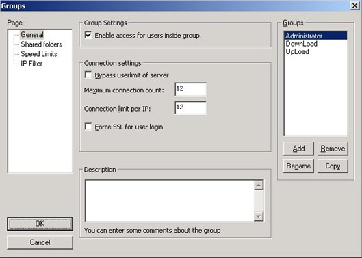 組設(shè)置中的“Speed Limits”和“IP Filter”跟全局設(shè)置里面的速度限制和IP過濾器設(shè)置方法是一樣的,請參照前面的內(nèi)容。只不過這個是僅僅針對這個組的用戶生效。而全局設(shè)置是對所有的用戶都生效。設(shè)置完畢之后點擊“OK”按鈕回到主界面。