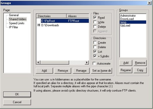 比如本例,主目錄是D:\Downloads,如果不做虛擬路徑設(shè)置,那么客戶端登錄進(jìn)來只能看到主目錄里面的內(nèi)容,還有一個E:\FTPRoot目錄下面的東西看不到。如何設(shè)置虛擬路徑?鼠標(biāo)右鍵點擊列表中的“E:\FTPRoot”目錄,在彈出的菜單里面選“Edit aliases”編輯別名;現(xiàn)在要把E:\FTPRoot目錄作為客戶端主目錄下的FTPRoot目錄,那么就在彈出的窗口里面輸入“D:\Downloads\FTPRoot”并點擊“OK”按鈕確定。注意拼寫規(guī)則,路徑的前面部分必須是主目錄的絕對路徑。這樣設(shè)置之后,在客戶端就可以看到一個“FTPRoot”目錄,這個目錄其實就是E:\FTPRoot目錄。