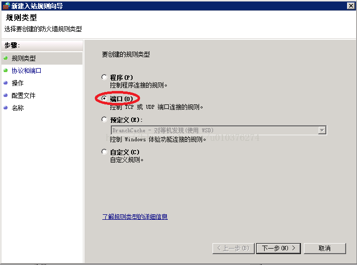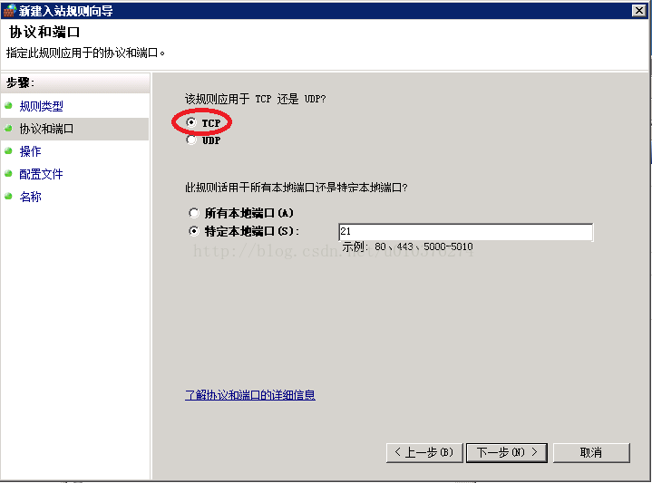 選擇“端口”,選擇“TCP”,輸入FTP端口,如果之前配置Filezilla時沒有改過,就用默認端口21