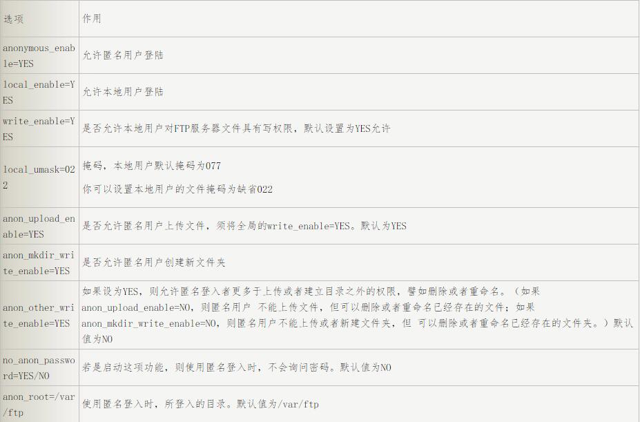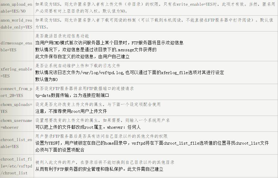 userlist_deny=YES/NO(YES) //決定vsftpd.user_list文件中的用戶是否能夠訪問FTP服務器。若設置為YES,則vsftpd.user_list文件中的用戶不允許訪問FTP,若設置為NO,則只有vsftpd.user_list文件中的用戶才能訪問FTP。