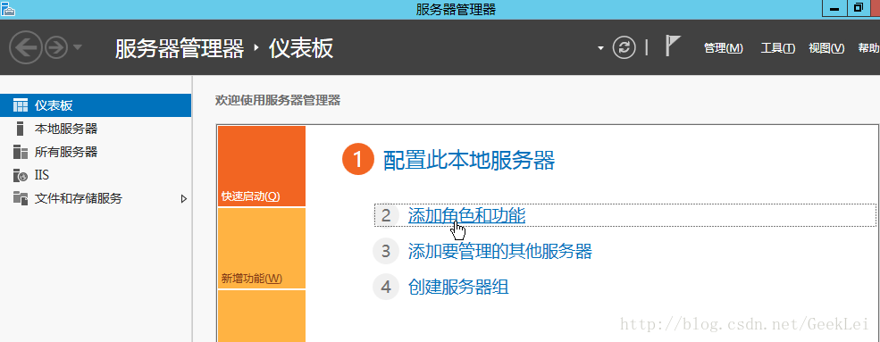 1.進入操作系統(tǒng),直接從啟動欄打開服務器管理器,選擇添加功能和角色