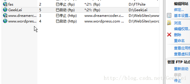 6.因為我已經(jīng)創(chuàng)建過FTP站點了,默認都是21端口,所以無法啟動這個站點。當有多個FTP站點使用同一端口時不能同時開啟。