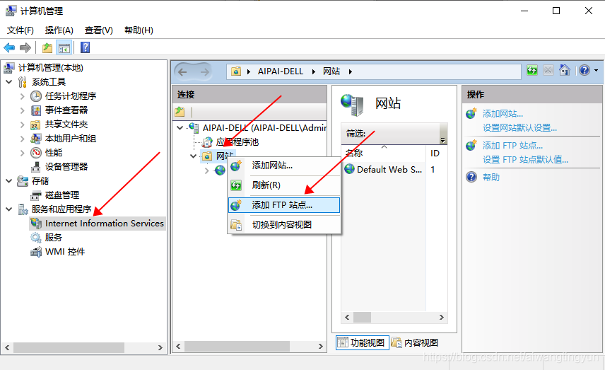 右鍵計算機選擇管理,打開計算機管理窗口面板,選擇 :計算機管理(本地) >> 服務和應用程序 >> Internet Information Services,選中右邊展開的網站,右鍵網站然后選擇 添加 FTP 站點