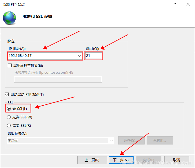 IP 地址就是你電腦的地址,如果不知道自己的 IP 地址的話,可以在 cmd 中輸入 inconfig 來查看,端口默認使用 21 就可以了,SSL 可以自己選擇,如果勾選了運行或者需要 SSL 的話就需要選擇 SSL 證書,一般使用 IIS Express Development Certificate 這個證書