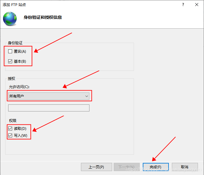 身份驗證如果勾選匿名則運行匿名訪問 FTP,不勾選則不允許匿名訪問 FTP,基本則指的是用戶訪問,授權里面選擇運行哪些用戶訪問,權限則設置用戶訪問的讀寫權限。