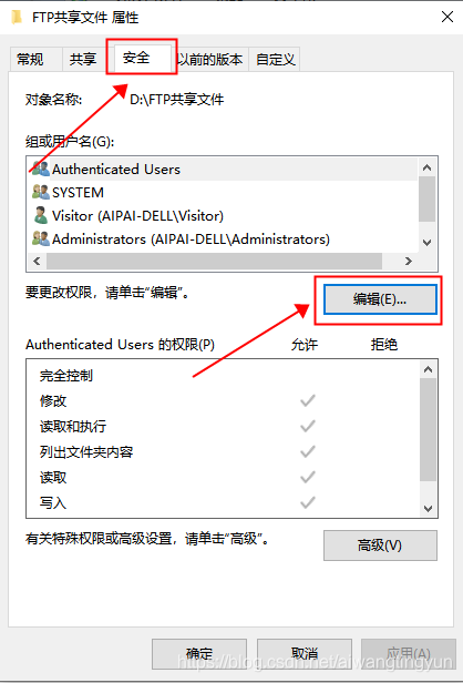 在彈出的 FTP 共享文件屬性窗口中選擇"安全",點擊編輯