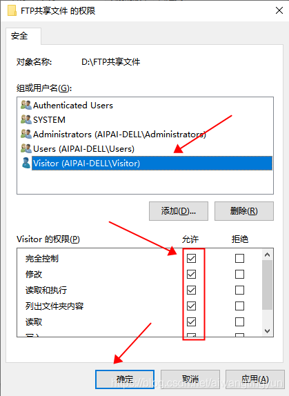 回到 FPT共享文件權限窗口,編輯新加用戶的權限為完全控制