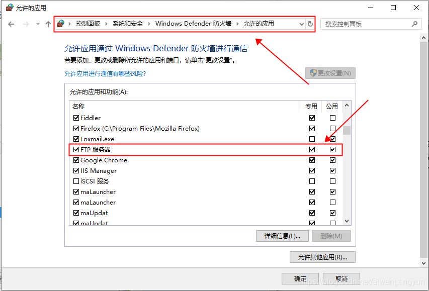 選擇:控制面板 >> 系統和安全 >> Windows Defender 防火墻 >> 允許的應用,找到 FTP 服務器,把后面兩個框都勾選掉: