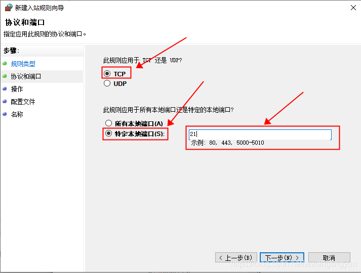 點擊"下一步",選擇協議為 TCP(因為FTP使用的是TCP協議),選擇特定本地端口,輸入 21(創建FTP服務時我們使用的是21端口):