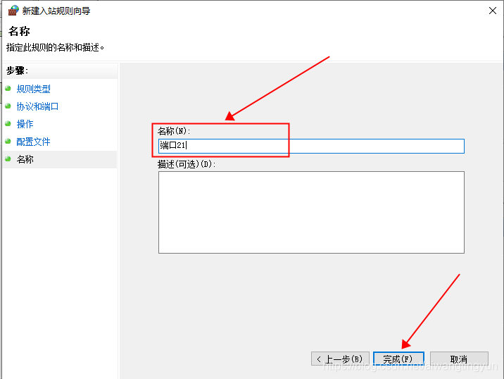 點擊完成就完成了入站規則創建,然后用同樣的方法完成出站規則的設置,同樣設置21端口