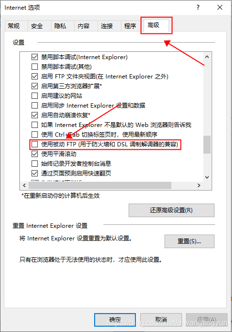 配置完上面的所有步驟時,如果出現了在客戶端訪問 FTP 服務時提示"無法訪問指定地址服務器"之類的彈窗提示,這是IE瀏覽器設置的問題,解決辦法為:打開 Internet Explorer 瀏覽器,點擊設置按鈕,找到 Internet 選項,在"Internet 選項"彈窗中的高級設置選項里找到"使用被動FTP"選項,去掉勾選就可以了: