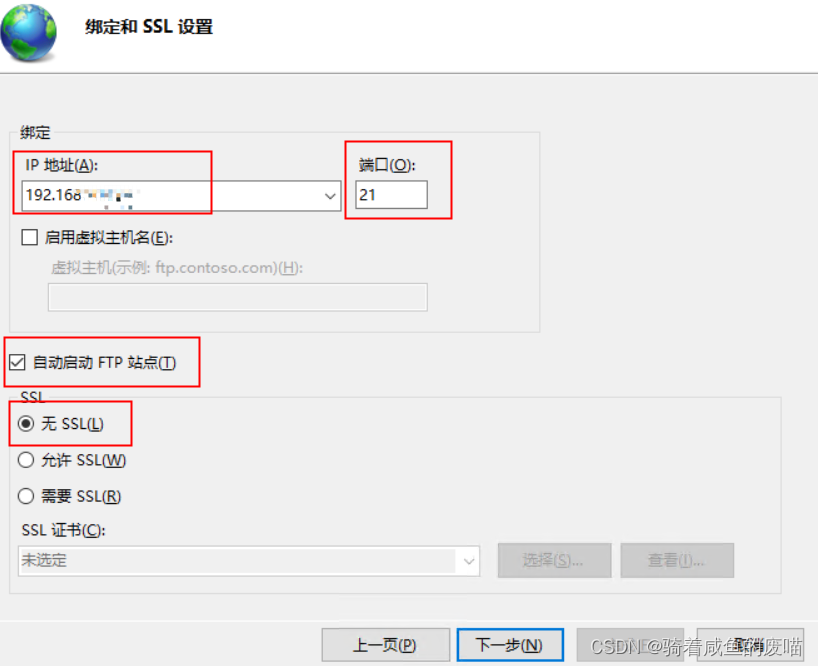 IP地址設置本機地址,端口21,勾選自動啟動FTP站點,無SSL