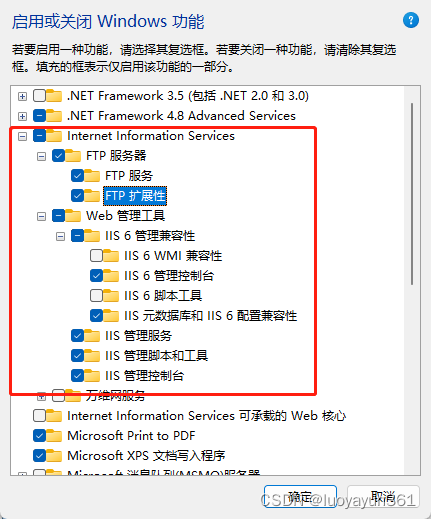 在彈窗中找到 Internet信息服務,并打開勾選以下配置 點擊確定