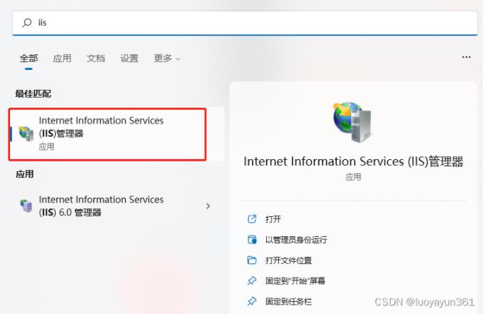 接下來 在開始欄中搜索 IIS 并點擊進入IIS管理器