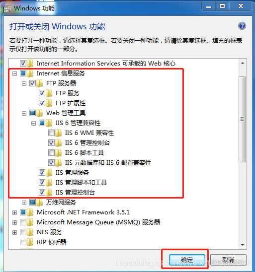 1.4 從“啟用或關(guān)閉Windows功能”彈窗中找到 Internet信息服務(wù) (或者Internet Information Services)并打開配置IIS并點(diǎn)擊確定