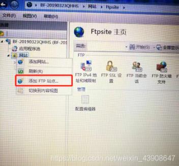 2.2.3 IIS網(wǎng)站管理器界面左邊導(dǎo)航欄找到“網(wǎng)站”,右鍵彈出菜單點(diǎn)擊“添加FTP站點(diǎn)”