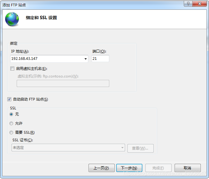2.2.4 配置網(wǎng)站(網(wǎng)站名稱:FtpSite 物理路徑:E:\ftpserver 本機(jī)IP地址(從下拉菜單選擇):192.168.43.147)