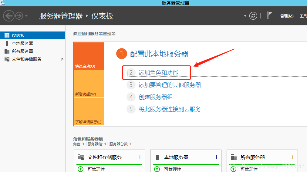 1. 打開Windows server管理面板,選擇添加角色和功能