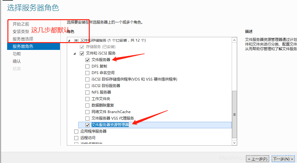 到服務器角色這一步的時候,選中文件服務器和文件服務器資源管理器