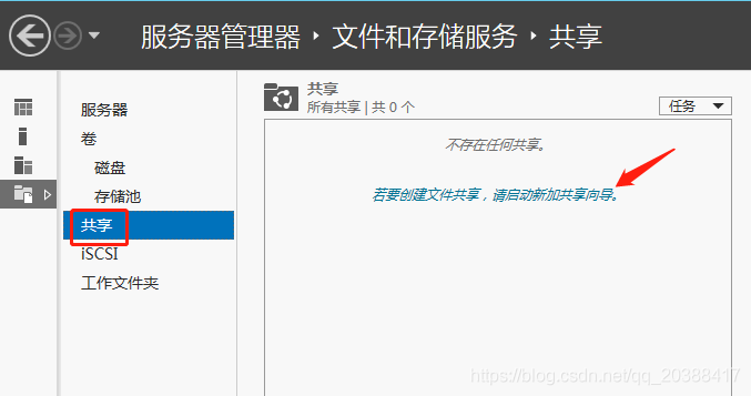 打開文件和存儲服務--共享--點擊若要創建文件共享,請啟動新加共享向導