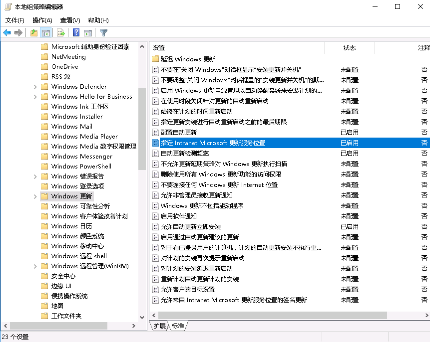 右鍵開始菜單圖標(biāo),選擇“運(yùn)行”,然后輸入gpedit.msc,依次選擇 “計算機(jī)配置” - “管理模板” - “Windows 組件” - “Windows 更新”,雙擊“指定 Intranet Microsoft 更新服務(wù)位置”:
