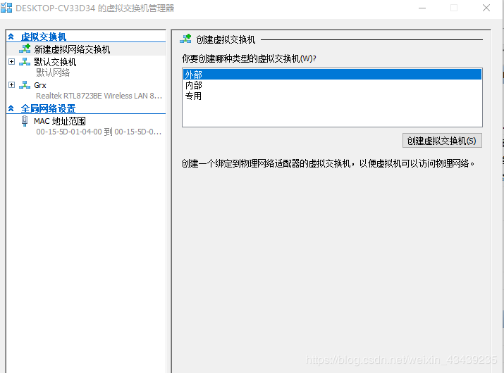 2. 選擇“新建虛擬網絡交換機”,在虛擬交換機類型列表中選擇“外部”,點擊“創建虛擬交換機”,創建一個虛擬交換機。