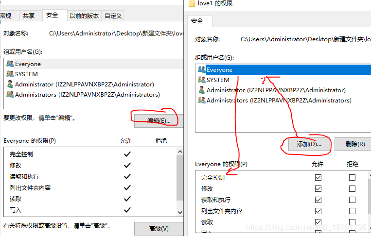 20.編輯權限–>安全–>編輯–>添加(everyone)–>給全部權限