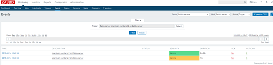 從截圖可以看到,在線用戶超過閥值,trigger為"PROBLEM"狀態只持續了1分鐘左右,即恢復到"OK"狀態,表明強制第3個用戶下線的腳本命令已執行,并且執行成功。