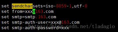 set sendcharsets=iso-8859-1,utf-8set from=xxx@163.comset smtp=smtp.163.com #163郵箱要開啟smtp授權set smtp-auth-user=xxx@163.com #認證用戶set smtp-auth-password=xxx #認證密碼