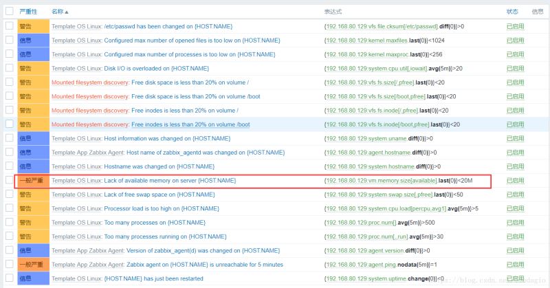 2)可以將zabbix自帶的模板中的對可用內存的監控中的觸發器的臨界值改為大于20,進入模板列表