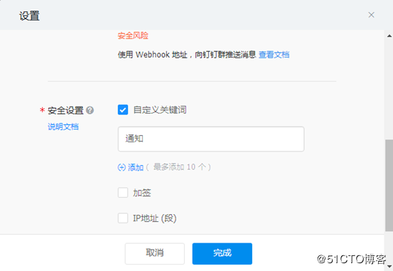 釘釘機(jī)器人需要進(jìn)行安全設(shè)置,這里我定義了關(guān)鍵詞”通知“,也就是說發(fā)送的消息中必須包含這個(gè)詞