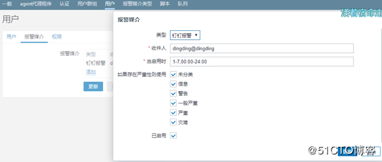 打開管理中的用戶,點(diǎn)擊需要設(shè)置郵件告警的用戶,然后在報(bào)警媒介中添加報(bào)警媒介,在彈框中選擇剛才定義的類型,收件人自定義,最后添加
