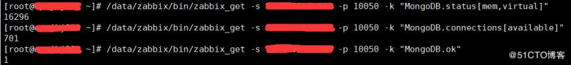 /data/zabbix/bin/zabbix_get -s xxx.xxx.xxx.xxx -p 10050 -k "MongoDB.status[mem,virtual]"/data/zabbix/bin/zabbix_get -s xxx.xxx.xxx.xxx -p 10050 -k "MongoDB.connections[available]"/data/zabbix/bin/zabbix_get -s xxx.xxx.xxx.xxx -p 10050 -k "MongoDB.ok"