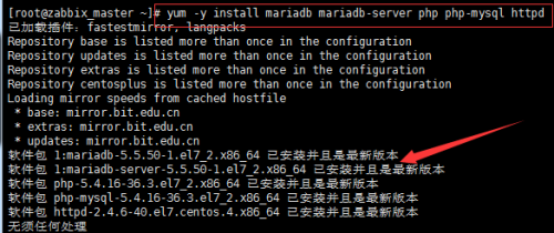 通過上圖,我們可以很明顯的看出centos7默認安裝的是php5.4、httpd2.4和maradb5.5,這個完全符合zabbix3.0對軟件版本的要求。lamp安裝完畢后,我們現(xiàn)在來配置mysql數(shù)據(jù)庫。